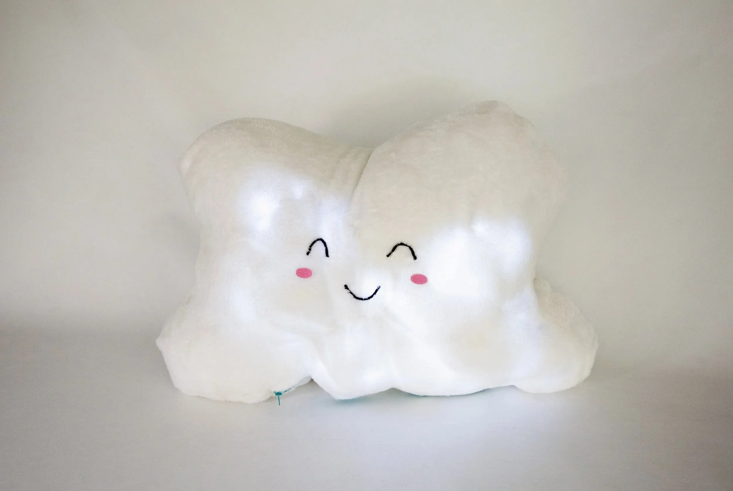 A pillow that plays soothing thunder and rain sounds along with ambient lighting, when you hug it, for studying, lounging, and sleeping.